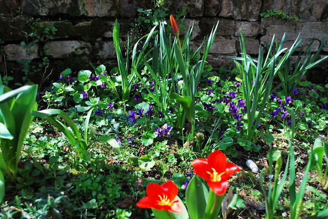 Questa per me è una primavera particolare, è la prima primavera che passo in questa casa, cioè è la prima primavera che trascorro in un giardino da quando avevo cinque anni e ci trasferimmo in un appartamento senza giardino. E quindi innanzitutto è una primavera di sorprese! Ché io mica lo sapevo che un bel giorno avrei aperto la porta finestra e avrei trovato tappeti di violette! Va bene tarassaco, margherite e nontiscordardimè (o occhi della Madonna o, tecnicamente, veronica), quelli me li potevo aspettare, ma le violette?! Io ho sempre adorato le violette! E profumano anche eh! Di quel profumo che mi ricorda certe passeggiate con i miei, in cui loro andavano per asparagi selvatici e noi bimbe per viole, ciclamini e quant'altro di colorato offrisse la natura, e ne facevamo mazzolini che quando arrivavamo a casa erano praticamente già mosci :D